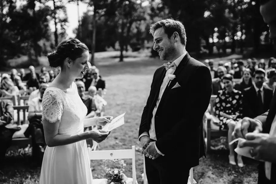 Nach dem Anziehen des Brautkleides fuhr Isabells Vater sie zum Rittergut Orr. Dort fand die freie Trauung statt, die sehr emotional und persönlich war.